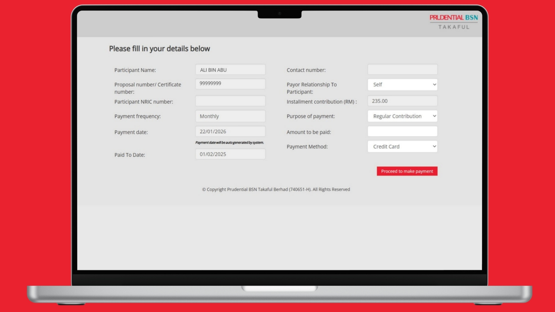 At PruBSN, your peace of mind matters to us. To make it easy for you to make payments for your contributions, we offer secure platforms such as the PruBSN Touch app and online payment via online payment platform.