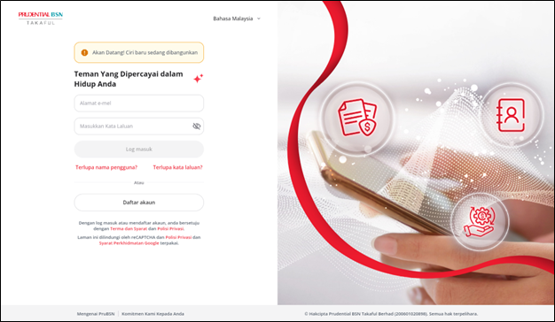 Untuk pengguna PruBSN Touch, daftar akaun baharu di PRUServices bagi memastikan anda terus dapat mengurus sijil tanpa gangguan. PruBSN Touch akan dihentikan operasinya sepenuhnya pada 1 Jun 2026. Selepas tarikh ini, platform tersebut tidak lagi boleh diakses.