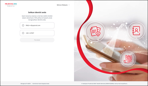 Alamat e mel diperlukan untuk mendaftar dan mengakses akaun PRUServices. Walau bagaimanapun, alamat e mel tersebut tidak semestinya yang berdaftar dengan PruBSN. Semasa pendaftaran akaun, anda akan diberi pilihan sama ada untuk menggunakan alamat e mel yang didaftarkan dengan PruBSN atau memberikan alamat e mel yang berbeza. Jika anda memilih untuk menggunakan alamat e mel yang berbeza, ia akan menggantikan alamat e mel sedia ada dalam rekod kami dan digunakan untuk semua komunikasi pada masa hadapan.