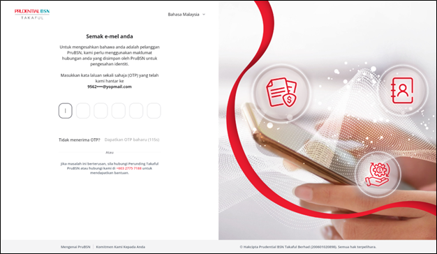 Langkah 4: Pilih saluran untuk menerima OTP (e‑mel atau SMS). OTP akan dihantar ke nombor telefon bimbit atau alamat e‑mel yang didaftarkan dengan PruBSN.